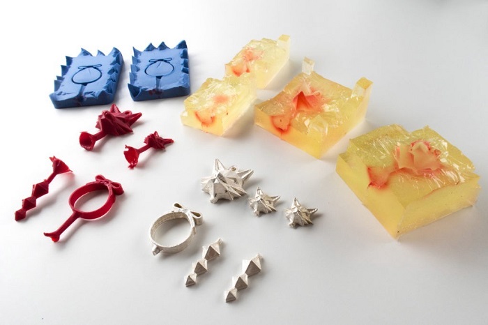3D printed wax patterns are then placed into a mold cavity and poured with investment casting, a plaster that surrounds the jewelry patterns and hardens. 3D printed wax masters are burnt out in a muffle furnace in a thermal cycle to the maximum temperature of 730-750*C thus creating a mold cavity in the hardened plaster. Jewelry pieces are cast with metals such as gold, silver, bronze to create the final product.